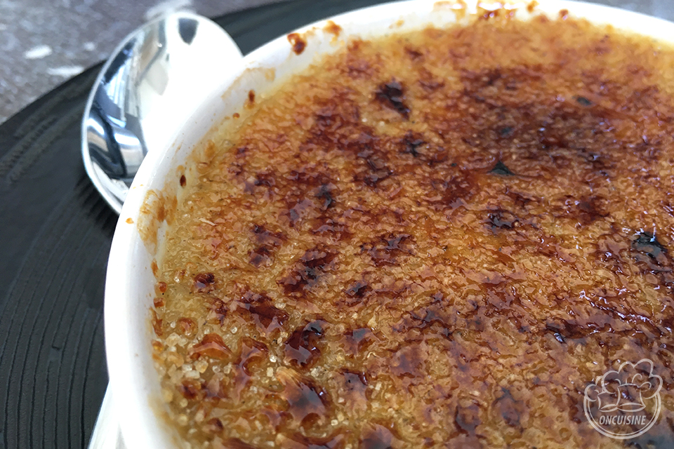 Au moment de la dégustation, versez une couche de cassonade sur le dessus de la crème. Enelvez le surplus puis caramélisez une première fois avec un chalumeau de cuisine.