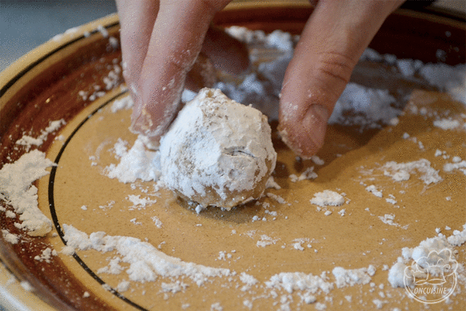 Roulez-les dans le sucre glace puis disposez-les sur une plaque de cuisson recouverte au préalable d’une feuille de papier sulfurisé.