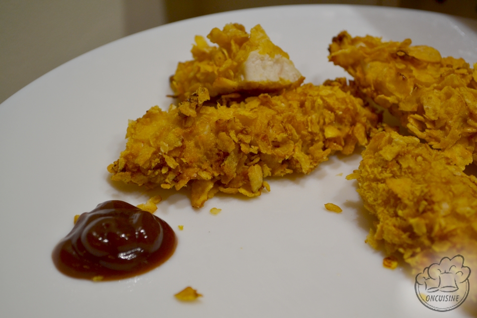 Du poulet, des corns flakes, de l'oeuf, du miel, de la moutarde, quelques épices et le tour est joué...