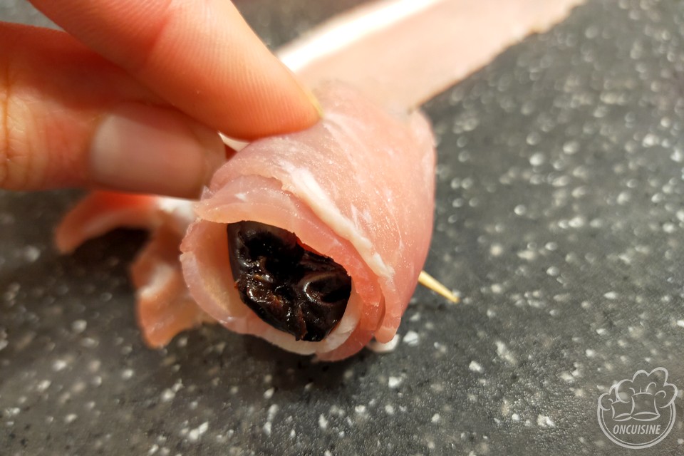 Enroulez chaque tranche de manière bien sérée autour des pruneaux.