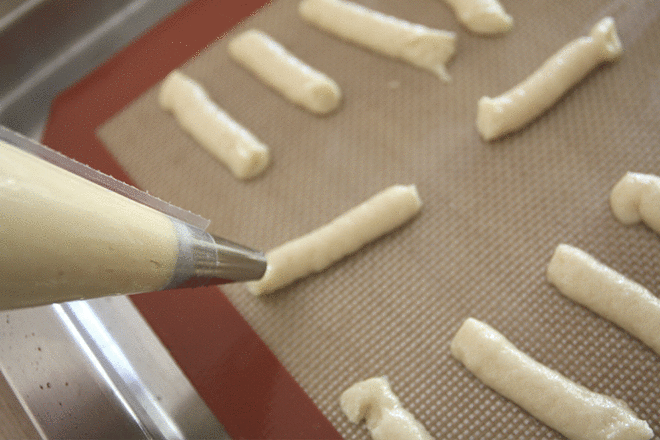Dresser à la poche, avec une petite douille unie, de fins bâtonnets espacés sur une plaque très légèrement beurrées.
